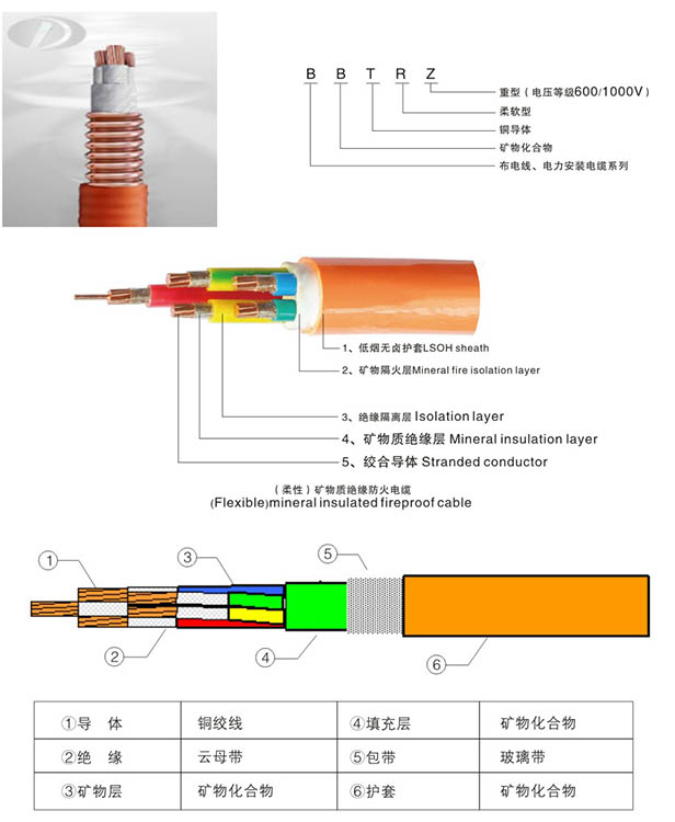 相對(duì)傳統(tǒng)的BTTZ剛性礦物絕緣電纜, BBTRZ柔性礦物絕緣電纜是由銅絞線、礦物化合物絕緣、和礦物化合物護(hù)套所構(gòu)成。其采用柔性結(jié)構(gòu),主要材料均采用無(wú)機(jī)材料,彌補(bǔ)了結(jié)構(gòu)硬、易燃燒、有毒等缺陷,并且具有一些其他電纜不具有的優(yōu)點(diǎn),如:耐火、載流量大、耐沖擊電壓、耐機(jī)械損傷、無(wú)鹵無(wú)毒、防爆、防水、耐腐蝕、壽命長(zhǎng)、安全、耐過(guò)載、耐高溫、成本低等特點(diǎn)。