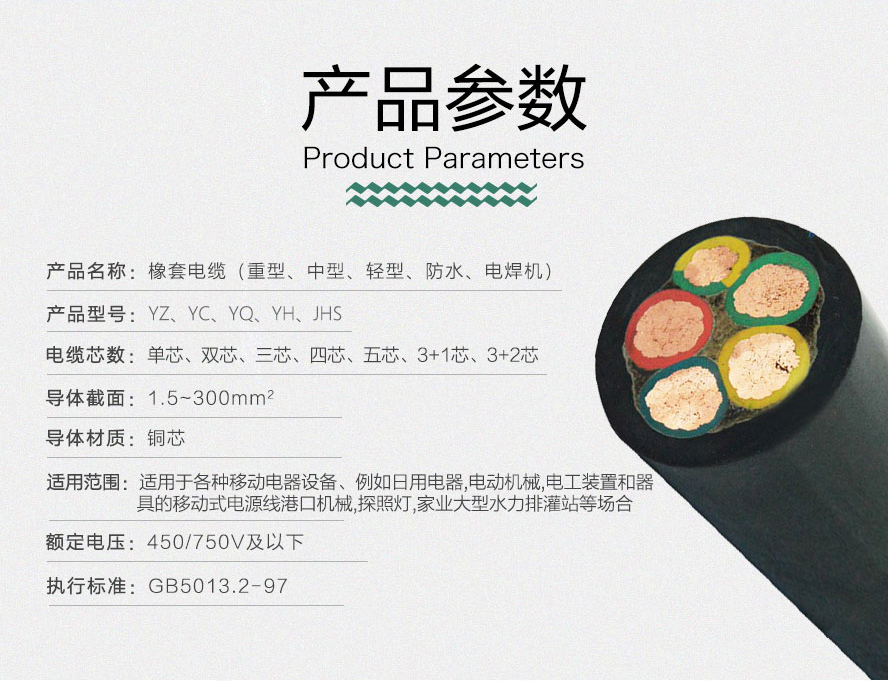 主要適用于各種電器、電動工具和各種移動式電器設備或輕型移動電氣設備,或用于工地上臨時施工用,同時可在室內(nèi)或戶外環(huán)境條件下使用。根據(jù)電纜所受的機械外力,在產(chǎn)品結構上分為輕型、中型和重型三類。其額定電壓為450/750V,執(zhí)行標準為:GB5013.2-97。